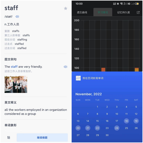 活动期间同学们使用“百词斩APP”规律学习单词,每天利用APP至少学习30词,并将学习结果以图文形式展示在打卡群里,以记录当天学习情况。此次打卡活动不仅有助于员工四六级备考,还充分调动自身学习积极性,巩固学风建设,提升英语学习成效。