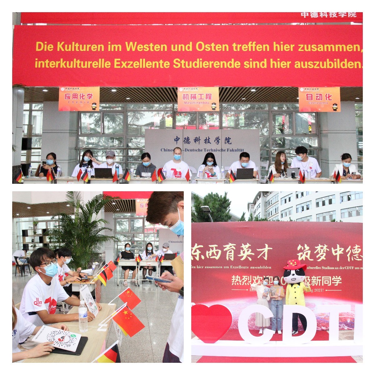 筑梦中德,国际氛围。报到大厅悬挂中德两国国旗,横幅标语采用中德双语,开展贴心志愿服务,优化报到流程,引导新生自主报到。报到现场,德国的外教老师与新生亲切问候,并答疑解惑。迎新红毯、报到背景打卡墙,体现中德两国文化的吉祥物中德大福在学院楼前与新生拍照留念。积极营造“激动、互动、感动”的报到氛围,为员工打造一个难忘的开学季。
