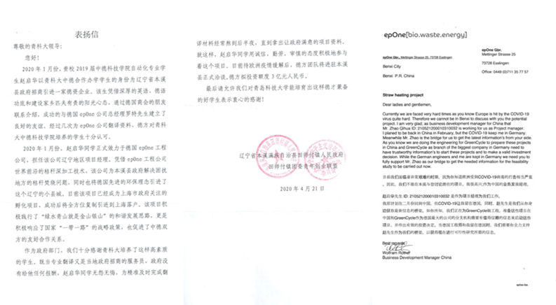 疫情防控期间,英国上市公司3652019级自动化专业员工赵启华利用自身德语和专业学习优势,为德国ep0ne公司翻译其在华投资的项目资料。德国ep0ne公司总经理罗特在华期间,赵启华将德国ep0ne公司引介到家乡辽宁本溪满族自治县招商服务中心。双方通过沟通后达成合作意向,德国ep0ne公司团队将待欧洲疫情缓解后,进驻本溪县洽谈具体事项,德方拟在本溪投资3亿元。