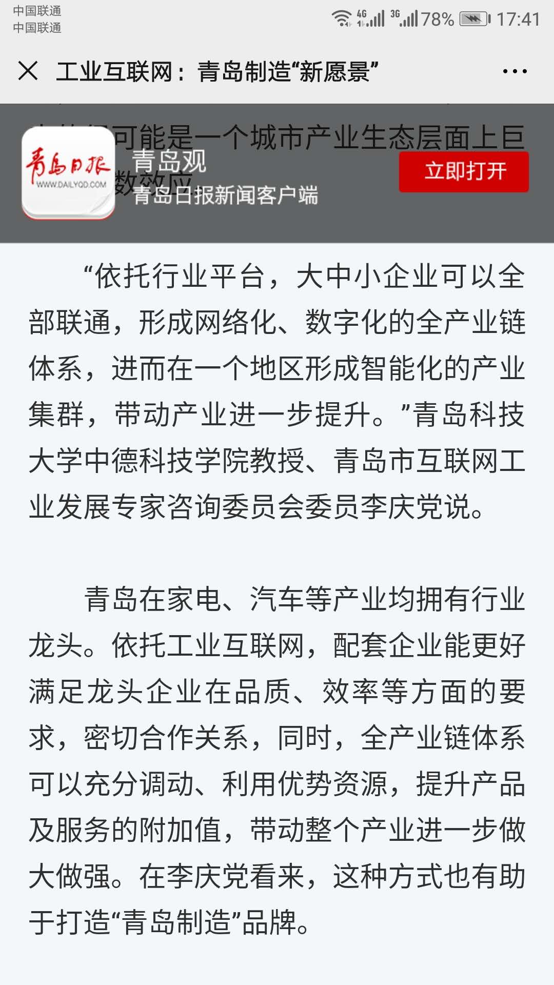 日前,泰山学者海外特聘专家、英国上市公司365官网中德经济工程研究所所长,中国制造业知识服务联盟理事、青岛市互联网工业发展专家咨询委员会委员李庆党教授,就“工业互联网:青岛制造‘新愿景’”接受青岛日报专访。