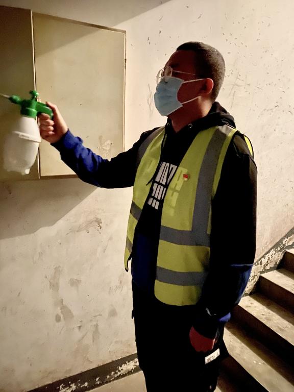 看到小区的消杀人员不足,他还自己购买84消毒液,自觉承担了所在住宅楼的消毒任务,每天两次对所在单元的楼道和单元门外进行全面的喷洒消毒,保证了生活小区居民的健康安全。