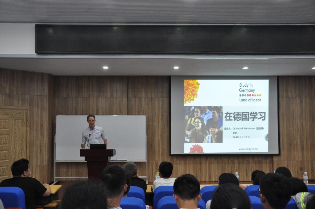 DAAD魏骏骁博士以在上海复旦大学汉语言文学学习的经验, 分析了留学对老员工的好处,并从DAAD的使命是促进国际学术交流与合作,DAAD在中国的主要任务是为中国职工提供信息咨询,DAAD传播德语与德国国情和促进中德高校的合作,DAAD搭建中德员工交流平台4个方面做了讲解。
