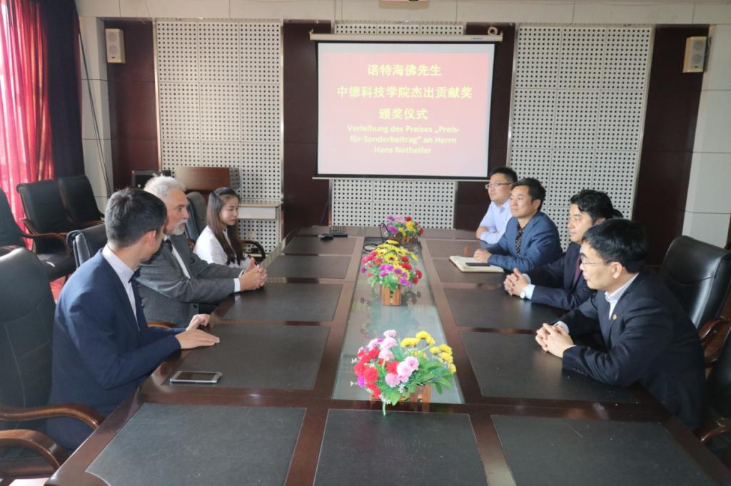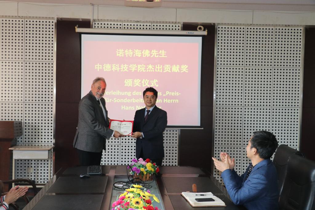 王江忠对Hans Nothelfer先生对学院发展的贡献表示感谢,希望Hans Nothelfer先生继续推动学院与德国高校间的教学、科研、人才培养等方面的合作,并常回来看看。