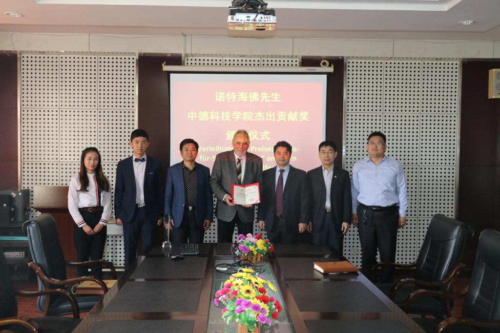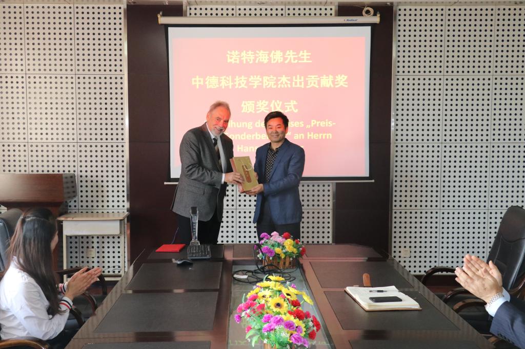 李镇江为Hans Nothelfer先生颁发了杰出贡献证书和奖杯,王江忠为Hans Nothelfer先生赠送了纪念品,以表彰其为推动两校间合作办学发展以及国际化人才培养所作出的杰出贡献。