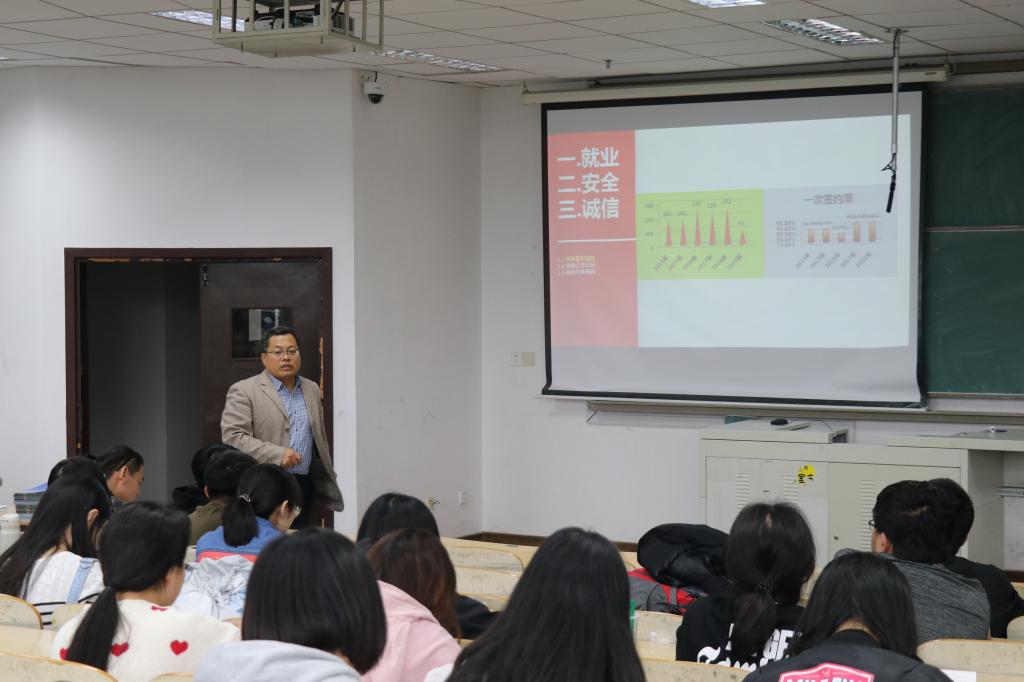 李磊介绍了目前学院毕业生的求职意向,从当前就业形势、就业推荐工作安排、求职简历制作、协议书使用、报到证使用、档案查询等方面的就业政策和就业事务办理流程做了详细讲解。