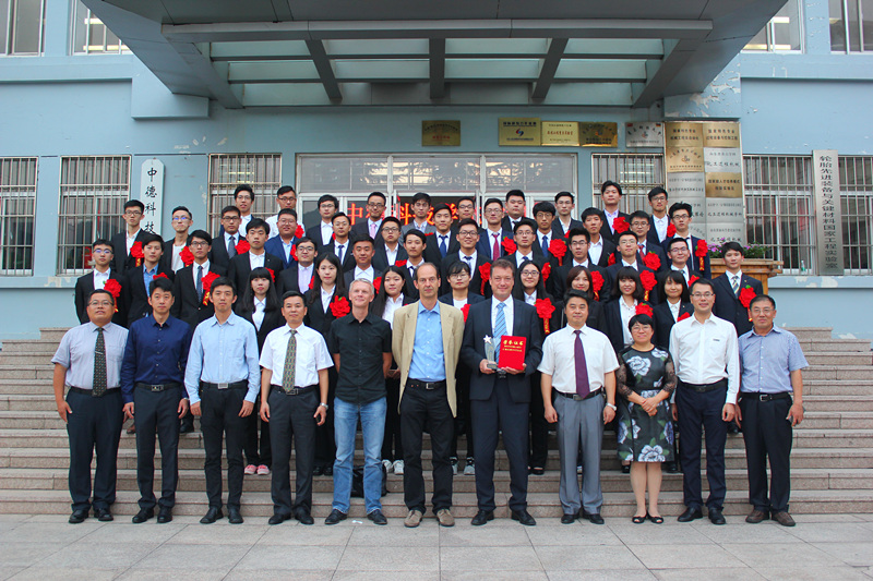李庆领为Robert Pandorf教授颁发了“合作院校教授突出贡献奖”奖杯和荣誉证书,以表彰潘道夫教授在公司与德国科布伦兹应用科技大学合作10年里,为两国、两校、两院国际化人才培养、文化交流等做出的突出贡献。