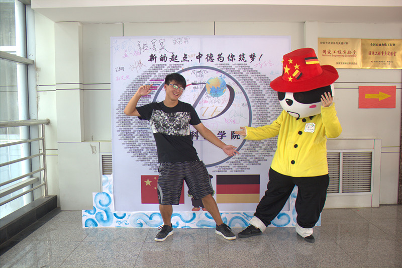 印象中德,微笑留照纪念。学院开展了“梦起中德,扬帆起航”的主题活动,学院在楼前竖立宣传板,宣传历年优秀学子的事迹,激励新生以学长学姐为榜样,树立远大的目标,奋发向上。新生在办理入学手续的同时,在“梦想”启航墙上晒出自己的“梦想”,并与自己的“梦想”合影,明确奋斗目标。“梦想”启航墙是由学院院徽、中德两国国旗、中德吉祥物大福组成,学院院徽四周围绕着无数个小的“CDTF”,象征着学院欢迎每一位新成员的加入。新生在启航墙前与一个憨态可掬的“大熊猫”——大福留念,大福面带微笑,张开双臂欢迎每一位怀揣梦想的新生,让新生感受到来自中德的热情。