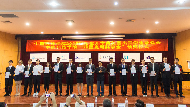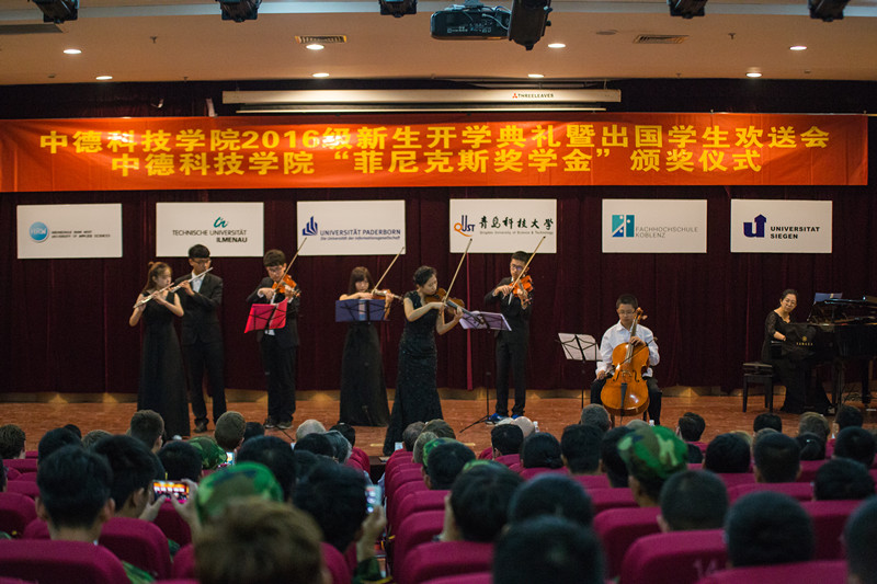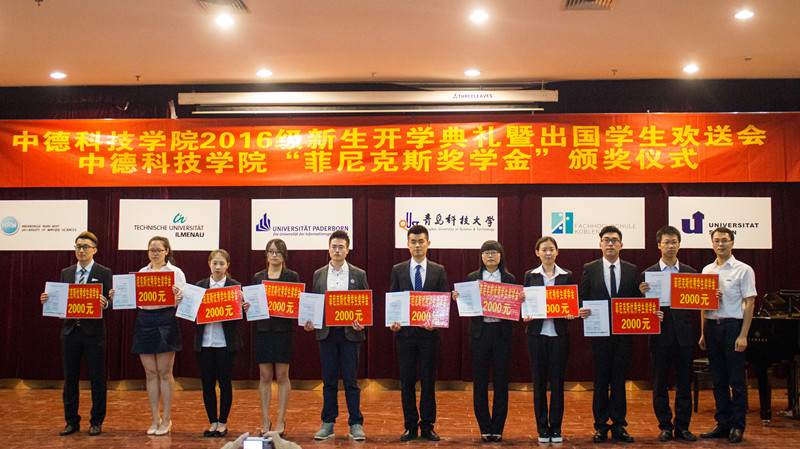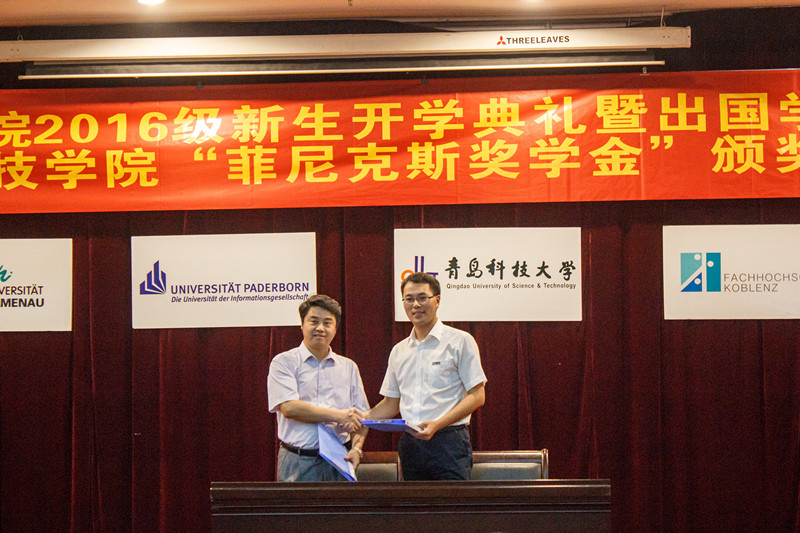 9月13日下午,英国上市公司3652016级新生开学典礼暨出国员工欢送会在崂山校区第三报告厅举行。副董事长李庆领,德国帕德博恩大学Warnecke教授,锡根大学Griese教授,帕德博恩大学Hübner博士,菲尼克斯(中国)投资有限公司工会主席郑巧林、企业发展部经理易书波,学校统战部、员工处、国际处、校团委、后勤处、公司领导和部分教师以及来自帕德博恩大学的28名硕士生和本科生参加了会议。