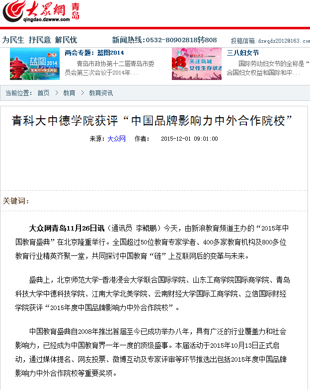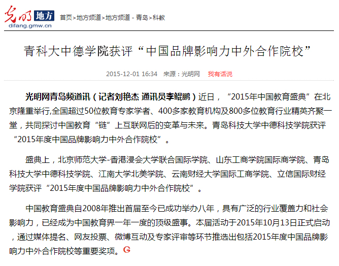 【光明网】【大众网】青科大中德学院获评“中国品牌影响力中外合作院校”