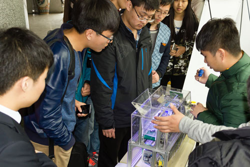 决赛在四方校区小五四广场和崂山校区图书馆大厅同时举行。两校区共4000余名同学参加了此次活动。此次赛事分为学院初赛、终审决赛两个环节。各学院共申报作品375件作品,经过初赛共选出133件参加此次决赛。决赛过程中公司作品以独特、新颖的特点吸引了大量的同学前来观摩,公司员工认真耐心的做了讲解,作品独特的设计和巧妙的构思,赢得了同学们的称赞。