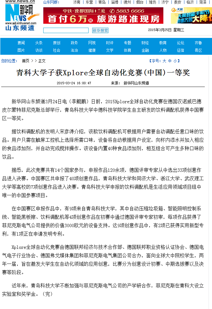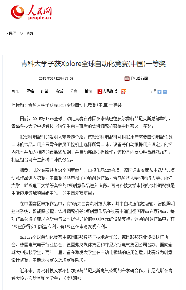 【人民网】【新华网】青科大学子自主研发饮料调配机获全球自动化竞赛大奖