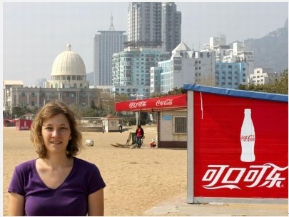 Claudia Schmidt vor der Skiline von Qingdao und der Cola-Bude am Strand. Foto: REPRO: GA