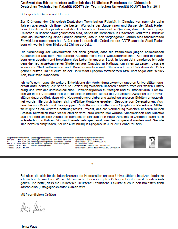 虽然中德两国相隔千山万水,虽然青岛和帕德博恩这两座城市在人口数量上相差悬殊,但是,我真诚地希望,两校间这种紧密联系的持续发展,将为进一步加强与巩固这两座城市之间业已存在的良好关系作出持久的贡献。在这里我要强调指出的是,在过去的岁月里,我们已经取得了长足的进展:由于两校间的密切合作,我们这两座城市之间的合作协议才得以签署。又由于两市间合作协议的签署,才有了这两座城市之间更加丰富多彩的合作,诸如:两市派代表团互访、音乐舞蹈团交流、青岛市的艺术家们赴帕德博恩市登台演出。目前还有另外一个合作前景非常广阔的项目,它必将进一步推动我们两市间的密切联系:我们两市剧院的艺术家们将第一次联袂演出由他们精心编排的剧目。首先在青岛首演,然后再在帕德博恩市演出。我们满怀激动地心情期待着艺术家们联袂演出获得成功。我热诚邀请各位届时光临2011年6月在青岛的首次演出。