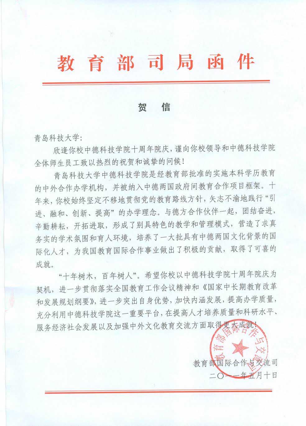 【中德学院十周年院庆】教育部国际合作与交流司为英国上市公司365十周年院庆发来贺信