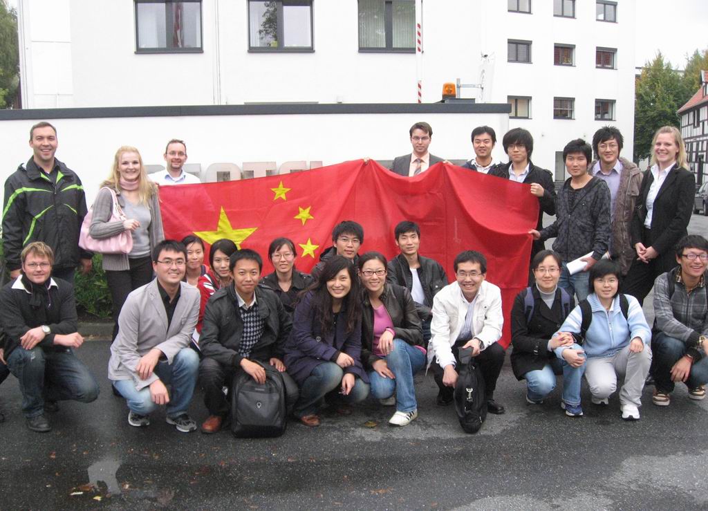 日前,公司机械专业在德国帕德博恩大学就读的20余名本科生和已经毕业的本科生及硕士生参观访问了德国著名钢铁及精密无缝钢管公司。期间正值中华人民共和国60周年大庆,该公司特意挂出中国国旗,以特有的方式对公司同学到访表示最热烈的欢迎,并与同学们合影留念,充分体现了德国人民对中国人民和公司学子的友好情谊。