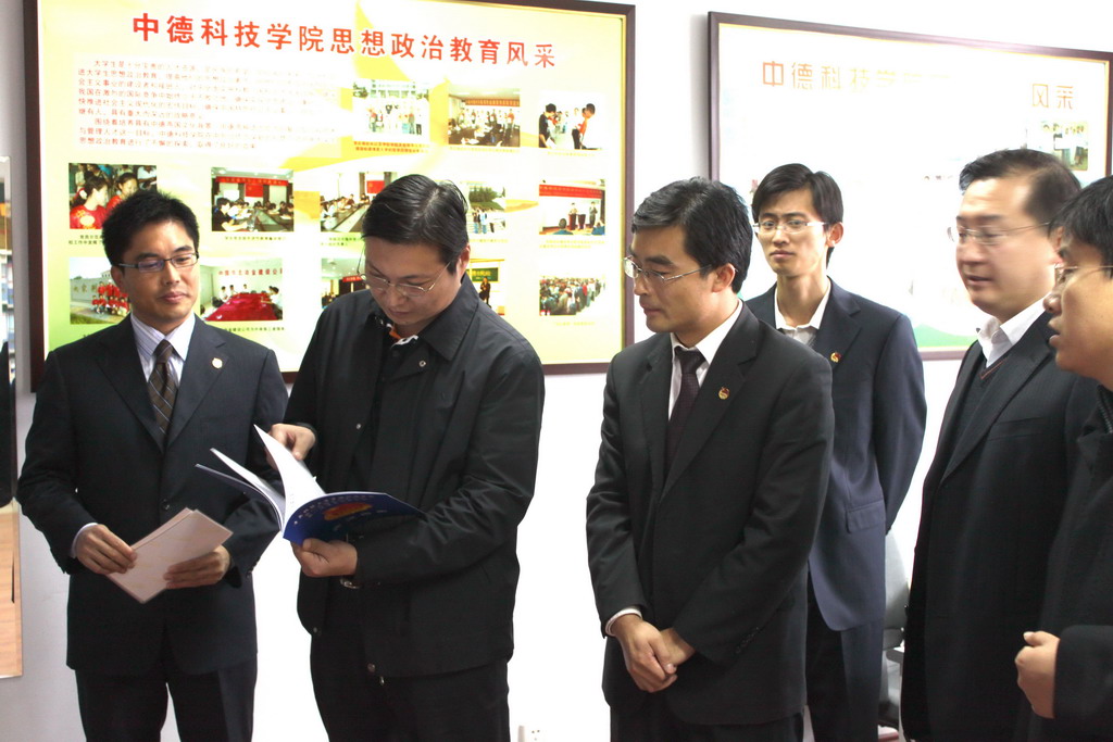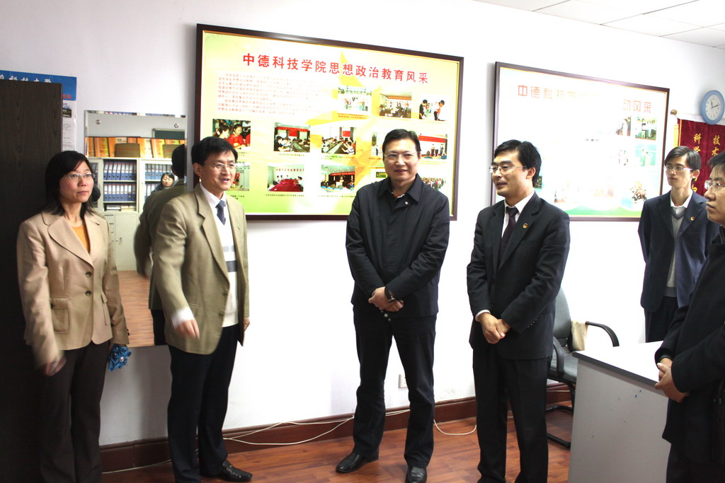 党总支书记郭曰铎代表学院对盖文兴部长一行的到来表示热烈的欢迎并介绍了中德学院的基本情况。分团委书记李春家向盖文兴部长一行汇报了学院共青团工作的开展情况。在听取了情况介绍和工作汇报后,盖文兴部长考察了分团委办公场所,查看了学院近几年团学工作获奖情况以及第一次“双代会”有关档案资料。