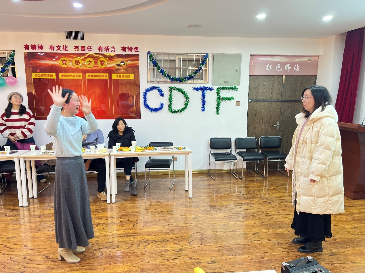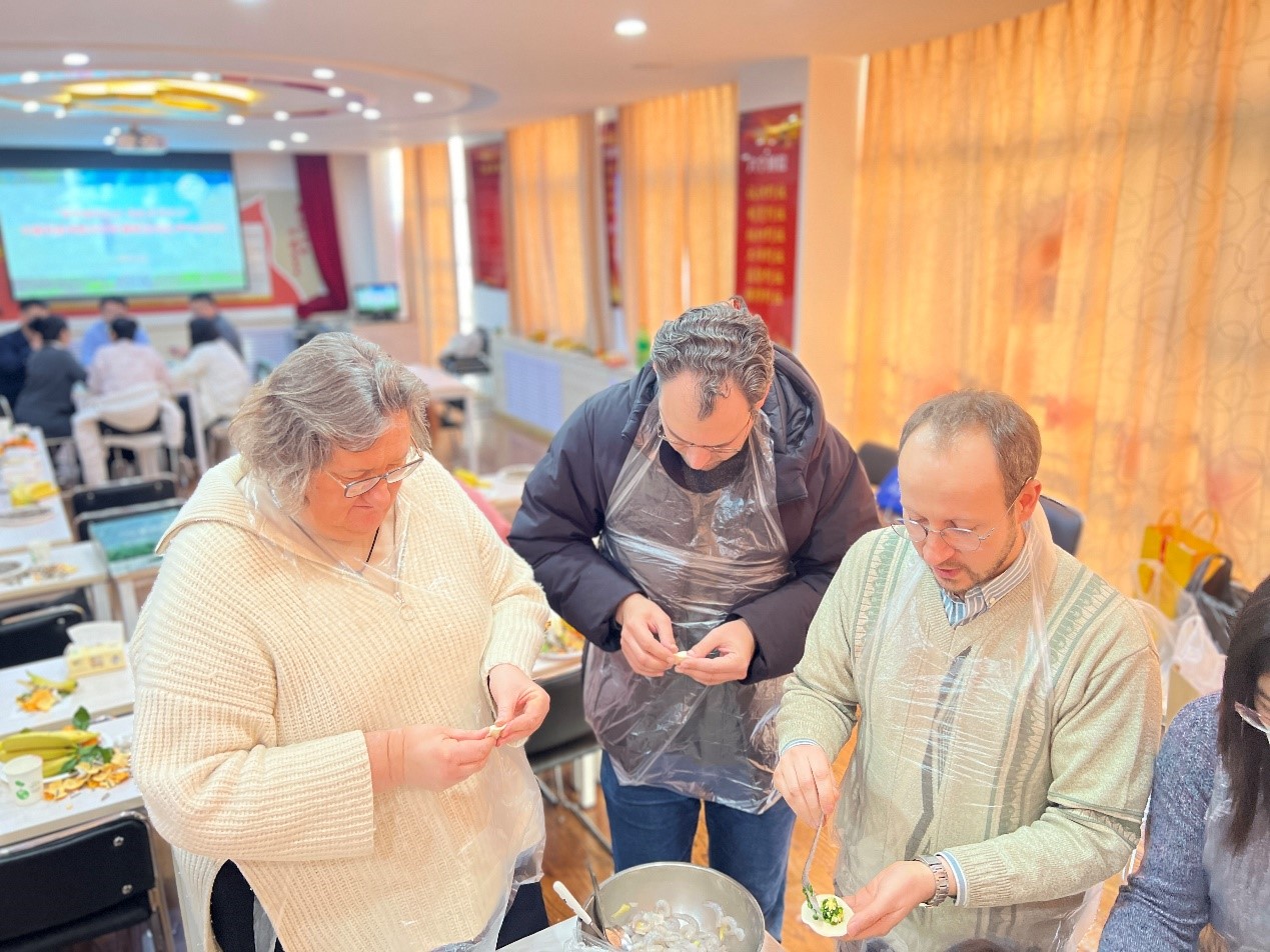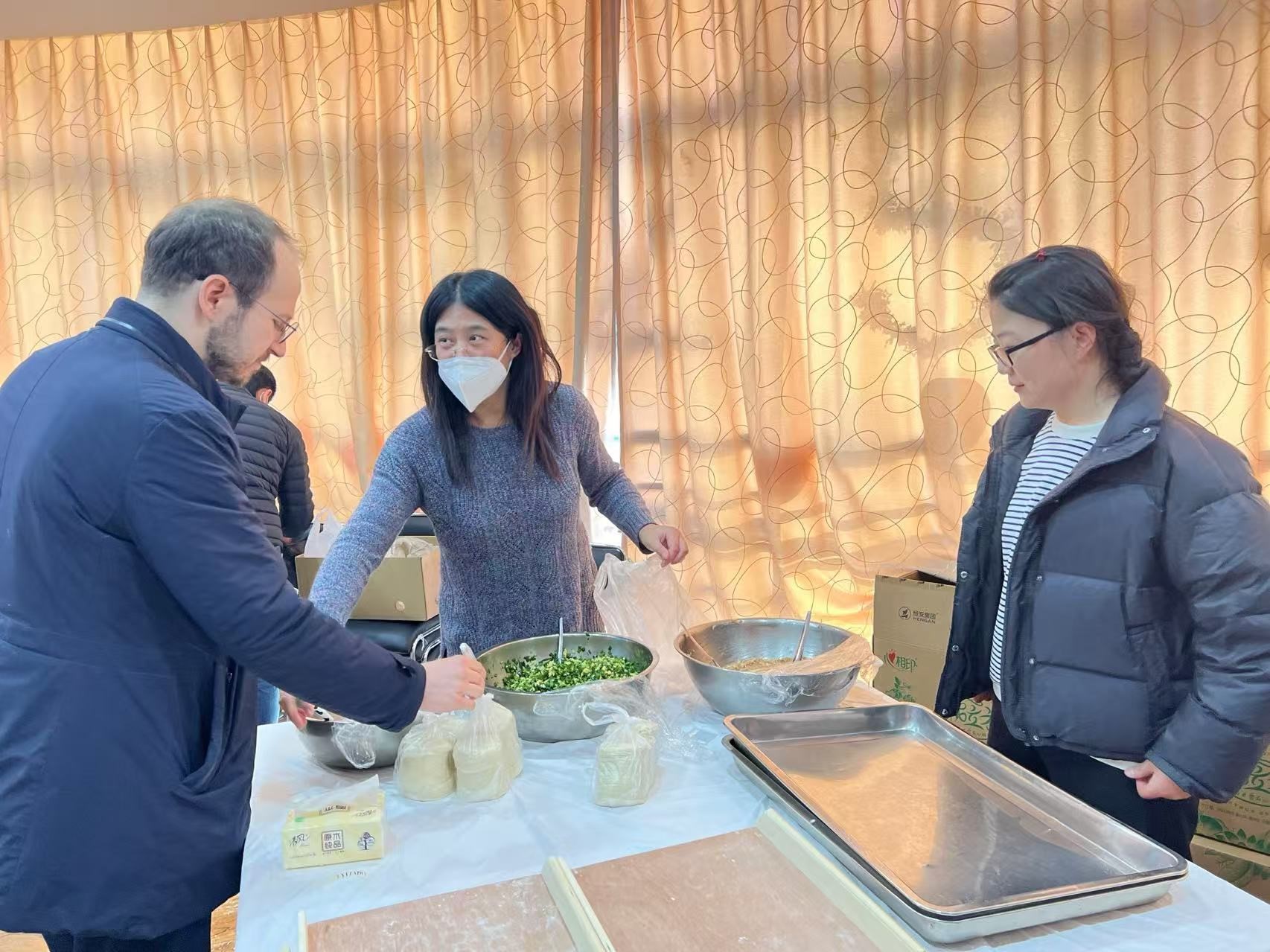 演出结束后,联欢活动进入了“蒙眼吃香蕉”和“你演我猜”趣味游戏环节,教职工们积极参与,乐在其中。在随后的包饺子环节中,老师们热情邀请德国外教一起动手包饺子,并向他们介绍中国新年喜庆祥和、和合美满的文化内核,讲述中国“以和为贵、协和万邦”的“和文化”。中、德教职工在欢声笑语中互致新年问候,增进了彼此之间的友谊。